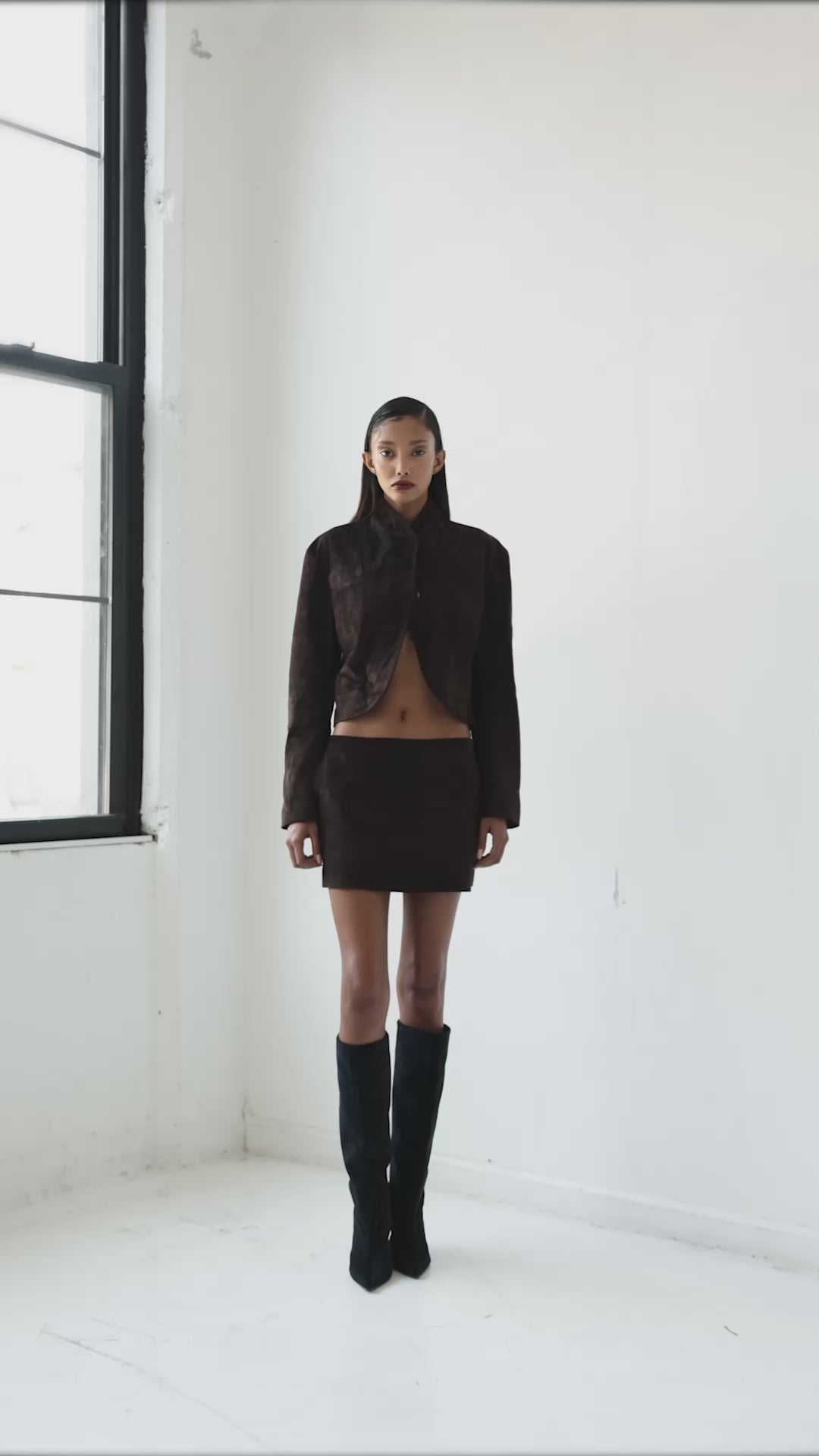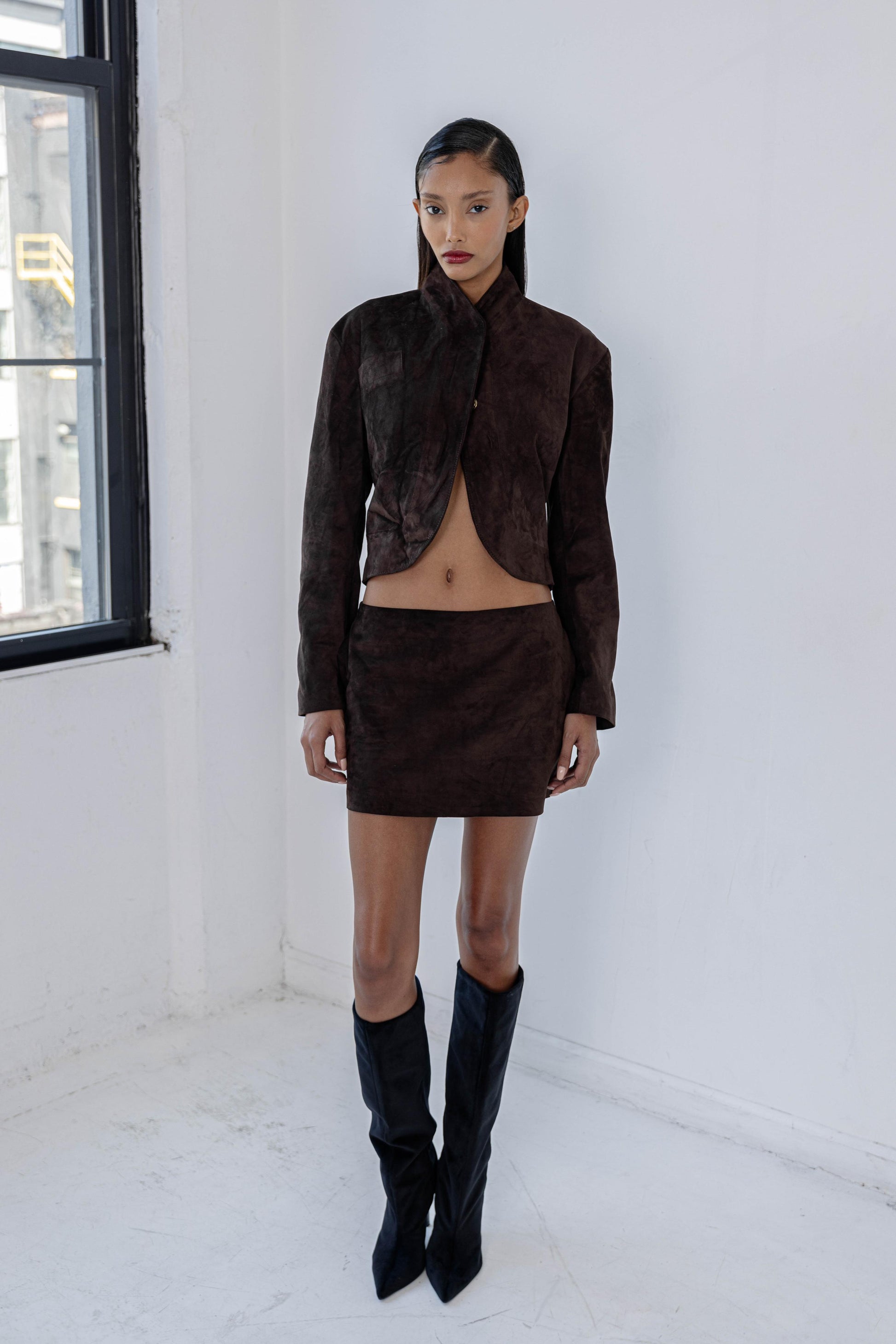 This mini skirt updates a timeless silhouette in soft suede. Cut to sit high on the waist, the clean lines are offset by the tactile finish of the fabric, giving the piece depth and presence. Its simplicity makes it endlessly versatile — pair it with the matching jacket for a coordinated look or style it solo with crisp tailoring.